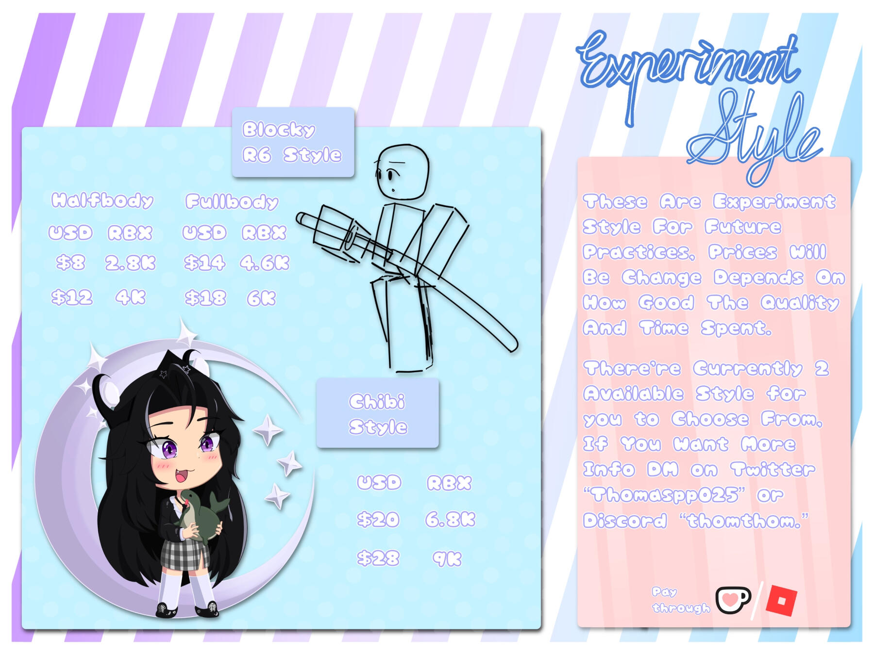 Experiment Style are for future practices with a cheaper prices than Normal Style, really suitable for people who want cheaper option with small budget.Commissioner's final product can be different than the example shown above.If you're interested to commission or want more info shoot me a DMs on twitter or discord "thomthom." and read the "TOS" before commissioning me.USD payment will be on Ko-Fi or [V-Gen]()---USD prioritize---