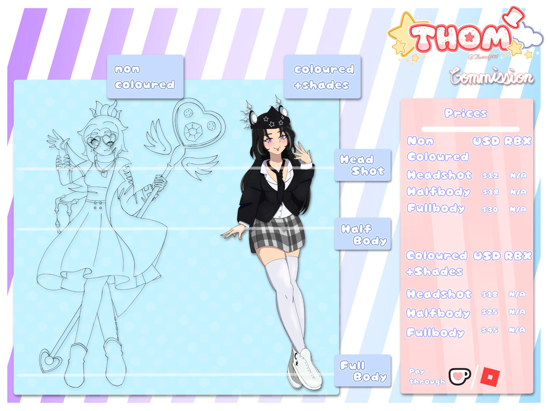 ALL robux prices shown is after taxed, prices can be different by paying shirts/gamepasses.Commission prices can be change depends on art quality and time spent.